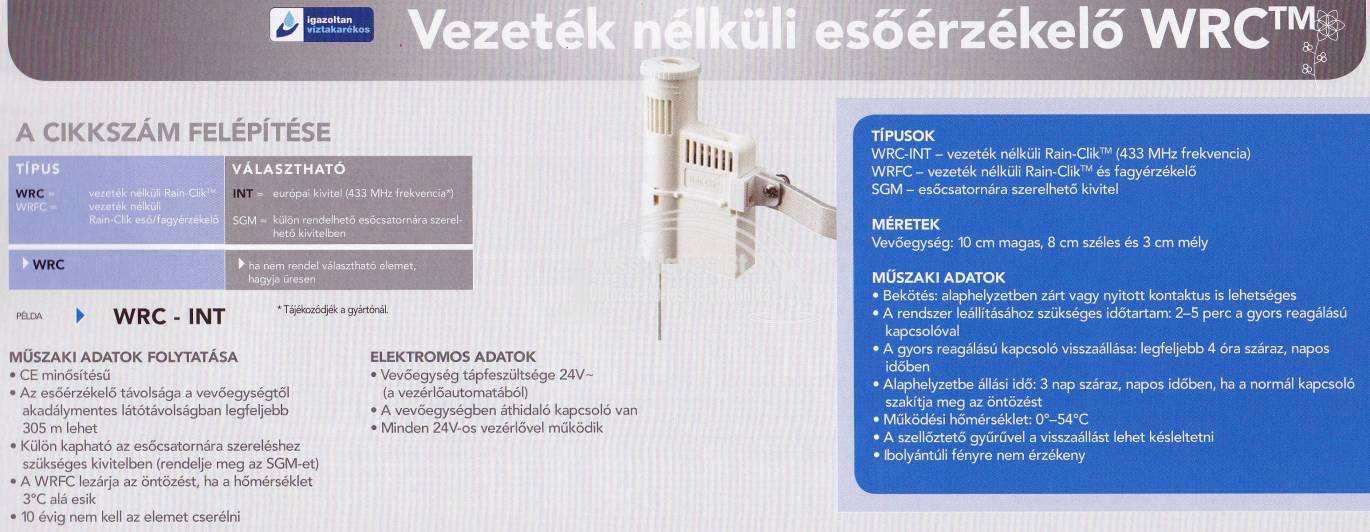 MŰSZAKI ADATOK • Bekötés: alaphelyzetben zárt vagy nyitott kontaktus is lehetséges • A rendszer leállításához szükséges időtartam: 2 – 5 perc a gyors reagálású kapcsolóval • A gyors reagálású kapcsoló visszaállása: legfeljebb 4 óra száraz, napos időben • Alaphelyzetbe állási idő: 3 nap száraz, napos időben, ha a normál kapcsoló szakítja meg az öntözést • Működési hőmérséklet: 0° – 54°C • A szellőztető gyűrűvel a visszaállást lehet késleltetni • Ibolyántúli fényre nem érzékeny • CE minősítésű • Az esőérzékelő távolsága a vevőegységtől akadálymentes látótávolságban legfeljebb 305 m lehet • Külön kapható az esőcsatornára szereléshez szükséges kivitelben (rendelje meg az SGM-et) • A WRFC lezárja az öntözést, ha a hőmérséklet 3°C alá esik • 10 évig nem kell az elemet cserélni