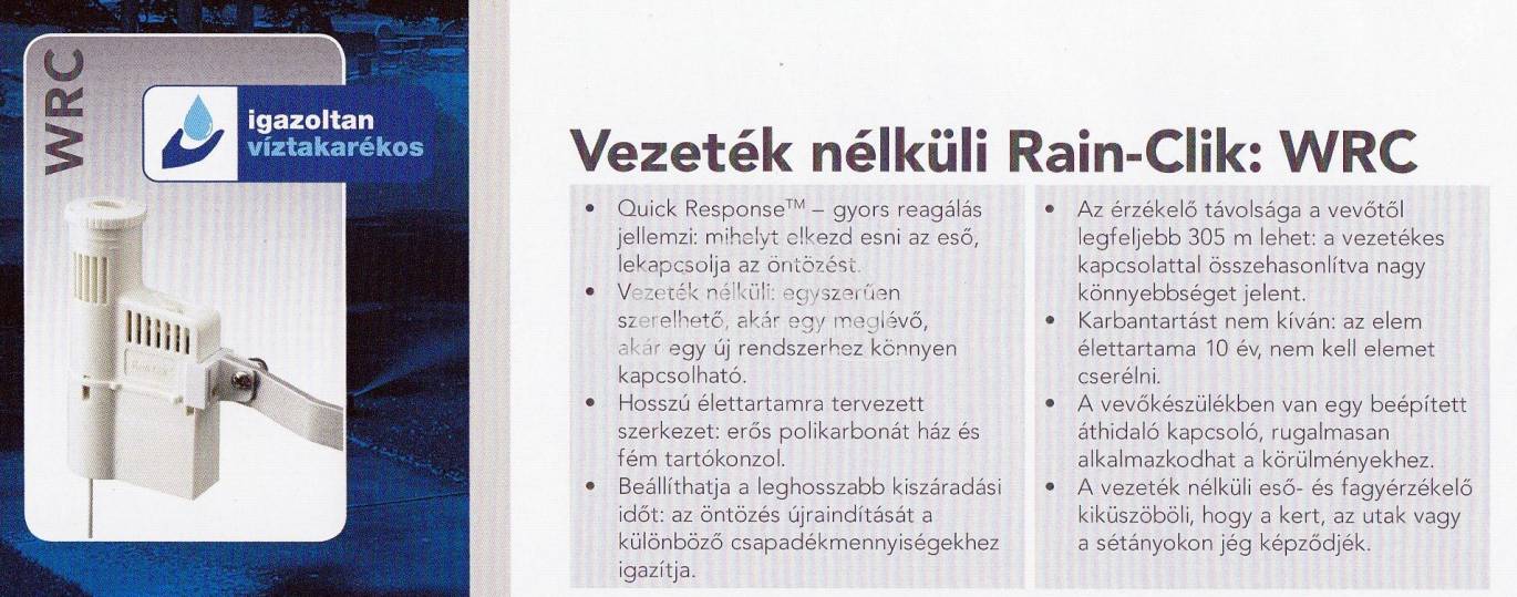 Hunter Vezeték nélküli Rain-Clik: WRC esőérzékelő • Quick ResponseTM – gyors reagálás jellemzi: mihelyt elkezd esni az eső, lekapcsolja az öntözést. • Vezeték nélküli: egyszerűen szerelhető, akár egy meglévő, akár egy új rendszerhez könnyen kapcsolható. • Hosszú élettartamra tervezett szerkezet: erős polikarbonát ház és fém tartókonzol. • Beállíthatja a leghosszabb kiszáradási időt: az öntözés újraindítását a különböző csapadékmennyiségekhez igazítja. • Az érzékelő távolsága a vevőtől legfeljebb 305 m lehet: a vezetékes kapcsolattal összehasonlítva nagy könnyebbséget jelent. • Karbantartást nem kíván: az elem élettartama 10 év, nem kell elemet cserélni. • A vevőkészülékben van egy beépített áthidaló kapcsoló, rugalmasan alkalmazkodhat a körülményekhez. • A vezeték nélküli eső- és fagyérzékelő kiküszöböli, hogy a kert, az utak vagy a sétányokon jég képződjék.