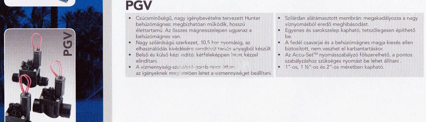 Hunter PGV 101 szabályozható 1"-os mágnesszelep • Csúcsminőségű, nagy igénybevételre tervezett Hunter behúzómágnes: megbízhatóan működik, hosszú élettartamú. Az összes mágnesszelepen ugyanaz a behúzómágnes van. • Nagy szilárdságú szerkezet, 10,5 bar nyomásig, az elhasználódás kivédésére rendkívül tartós anyagból készült • Belső és külső kézi indító: kétféleképpen lehet kézzel elindítani. • A vízmennyiség-szabályzó gomb nincs útban, az igényeknek megfelelően lehet a vízmennyiséget beállítani.