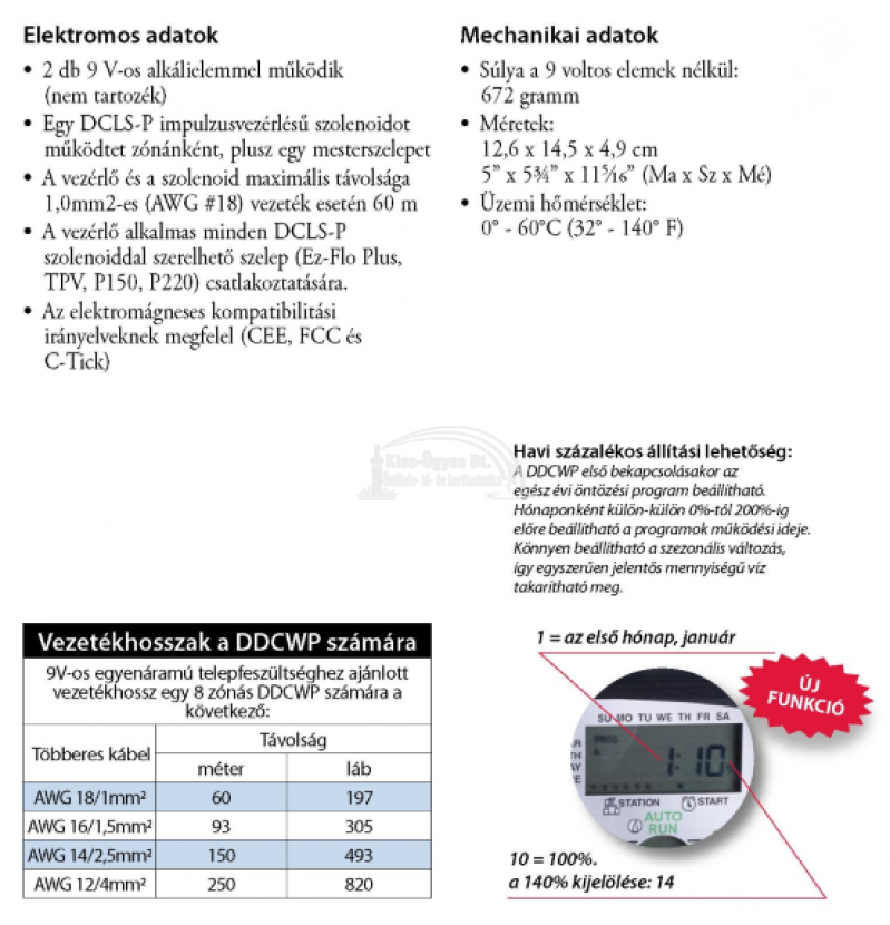 Elektromos adatok • 2 db 9 V-os alkálielemmel működik (nem tartozék) • Egy DCLS-P impulzusvezérlésű szolenoidot működtet zónánként, plusz egy mesterszelepet • A vezérlő és a szolenoid maximális távolsága l,0mm2-es (AWG #18) vezeték esetén 60 m • A vezérlő alkalmas minden DCLS-P szolenoiddal szerelhető szelep (Ez-Flo Plus, TPV, Pl 50, P220) csatlakoztatására. • Az elektromágneses kompatibilitási irányelveknek megfelel (CEE, FCC és C-Tick)
