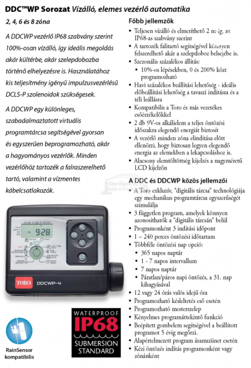 A DDC és DDCWP közös jellemzői • A Toro exkluzív, "digitális tárcsa" technológiája egy mechanikus programtárcsa egyszerűségét szimulálja • 3 független program, amelyek könnyen azonosíthatók a "digitális tárcsán" belül • Programonként 3 indítási időpont • 1 - 240 perces öntözési időtartam • Többféle öntözési nap opció: • 365 napos naptár • 1 - 7 napos intervallum • 7 napos naptár • Páratlan/páros napi öntözés, a 31. nap kihagyásával • 12 vagy 24 órás valós idejű óra • Programozható késleltetés eső esetén • Programozható mesterszelep • Kényelmes programáttekintő funkció • Beépített gombelem segítségével a beállított programot 5 évig megőrzi. • Alapértelmezett program áramszünet esetén • Kézi öntözés indítás programonként vagy zónánként.