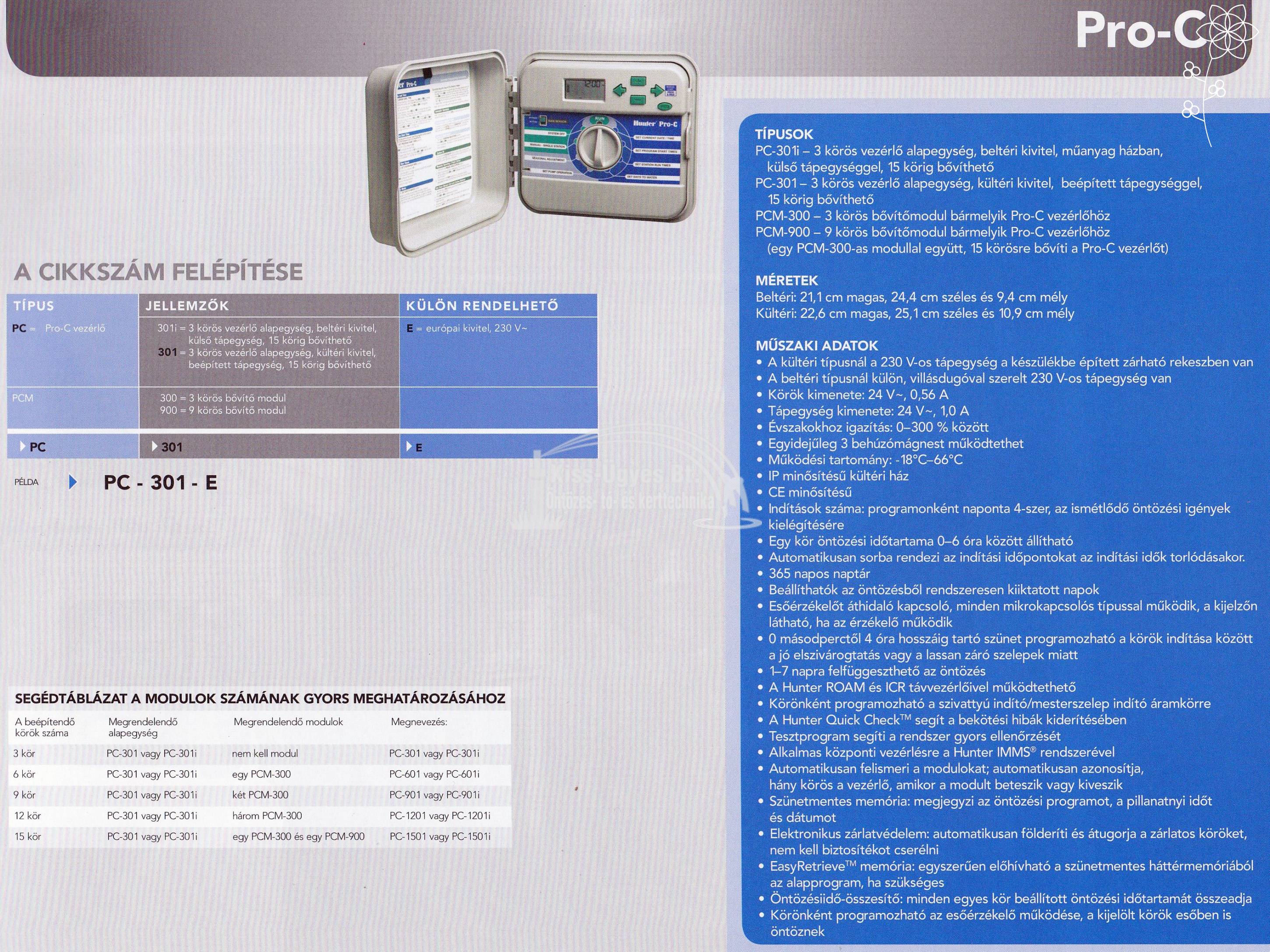 MŰSZAKI ADATOK • A kültéri típusnál a 230 V-os tápegység a készülékbe épített zárható rekeszben van • A beltéri típusnál külön, villásdugóval szerelt 230 V-os tápegység van • Körök kimenete: 24 V~, 0,56 A • Tápegység kimenete: 24 V~, 1,0 A • Évszakokhoz igazítás: 0–300 % között • Egyidejűleg 3 behúzómágnest működtethet • Működési tartomány: -18°C–66°C • IP minősítésű kültéri ház • CE minősítésű • Indítások száma: programonként naponta 4-szer, az ismétlődő öntözési igények kielégítésére • Egy kör öntözési időtartama 0–6 óra között állítható • Automatikusan sorba rendezi az indítási időpontokat az indítási idők torlódásakor. • 365 napos naptár • Beállíthatók az öntözésből rendszeresen kiiktatott napok • Esőérzékelőt áthidaló kapcsoló, minden mikrokapcsolós típussal működik, a kijelzőn látható, ha az érzékelő működik • 0 másodperctől 4 óra hosszáig tartó szünet programozható a körök indítása között  a jó elszivárogtatás vagy a lassan záró szelepek miatt • 1–7 napra felfüggeszthető az öntözés • A Hunter ROAM és ICR távvezérlőivel működtethető • Körönként programozható a szivattyú indító/mesterszelep indító áramkörre • A Hunter Quick CheckTM segít a bekötési hibák kiderítésében • Tesztprogram segíti a rendszer gyors ellenőrzését • Alkalmas központi vezérlésre a Hunter IMMS® rendszerével • Automatikusan felismeri a modulokat; automatikusan azonosítja,  hány körös a vezérlő, amikor a modult beteszik vagy kiveszik • Szünetmentes memória: megjegyzi az öntözési programot, a pillanatnyi időt  és dátumot • Elektronikus zárlatvédelem: automatikusan földeríti és átugorja a zárlatos köröket, nem kell biztosítékot cserélni • EasyRetrieveTM memória: egyszerűen előhívható a szünetmentes háttérmemóriából az alapprogram, ha szükséges • Öntözésiidő-összesítő: minden egyes kör beállított öntözési időtartamát összeadja • Körönként programozható az esőérzékelő működése, a kijelölt körök esőben is öntöznek