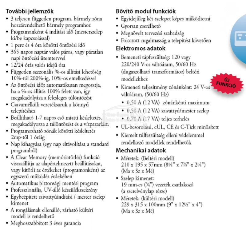 További jellemzők • 3 teljesen független program, bármely zóna hozzárendelhető bármely programhoz • Programonként 4 indítási idő (mesterszelep ki/be kapcsolással) • 1 perc és 4 óra közötti öntözési idő • 365 napos naptár valós páros, vagy páratlan napi öntözési ütemtervvel • 12/24 órás valós idejű óra • Független szezonális %-os állítási lehetőség 10%-tól 200%-ig, 10%-os emelkedéssel • Az öntözési időt automatikusan megosztja, ha a %-os állítás 100% felett van, így megakadolyáza a felesleges túlöntözést • Csavarnélküli vezetéksaruk a könnyű telepítéshez • Beállítható 1-7 napos eső miatti késleltetés, megakadályozza a túlöntözést és a vízpazarlást. • Programozható zónák közötti késleltetés 2mp-től 1 óráig • Nap kihagyása (egy nap eltávolítása a standard programból) • A Clear Memory (memóriatörlés) funkció visszaállítja az alapértelmezett beállításokat, vagy kitörli az értékeket (programonként) az egyszerű működés érdekében • Automatikus biztonsági mentési program • Professzionális, UV-álló készülékszekrény • Egybeépített szivattyúindítási / mester szelep kimenet • A rongálásnak ellenálló, zárható kültéri modell is rendelhető • Meghosszabbított 3 éves garancia