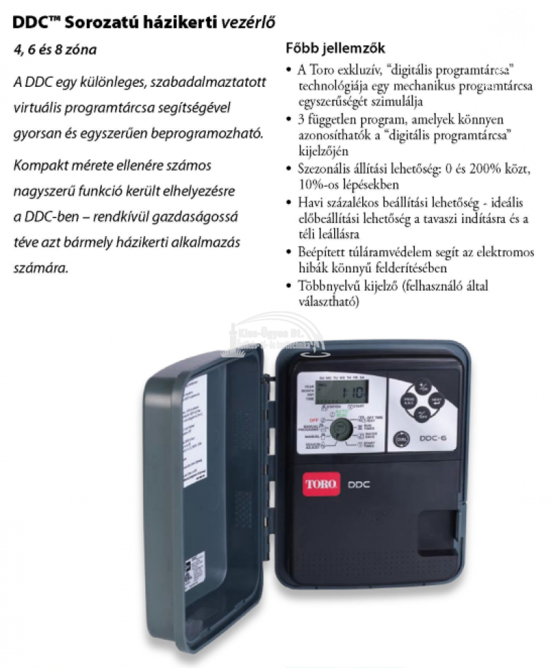 Főbb jellemzők • A Toro exkluzív, "digitális programtárcsa" technológiája egy mechanikus programtárcsa egyszerűségét szimulálja • 3 független program, amelyek könnyen azonosíthatók a "digitális programtárcsa" kijelzőjén • Szezonális állítási lehetőség: 0 és 200% közt, 10%-os lépésekben • Havi százalékos beállítási lehetőség - ideális előbeállítási lehetőség a tavaszi indításra és a téli leállásra • Beépített túláramvédelem segít az elektromos hibák könnyű felderítésében • Többnyelvű kijelző (felhasználó által választható)