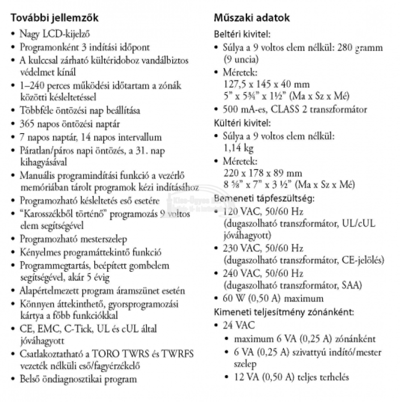 További jellemzők • Nagy LCD-kijelző • Programonként 3 indítási időpont • A kulccsal zárható kültéridoboz vandáibiztos védelmet kínál • 1-240 perces működési időtartam a zónák közötti késleltetéssel • Többféle öntözési nap beállítása • 365 napos öntözési naptár • 7 napos naptár, 14 napos intervallum • Páratlan/páros napi öntözés, a 31. nap kihagyásával • Manuális programindítási funkció a vezérlő memóriában tárolt programok kézi indításához • Programozható késleltetés eső esetére • "Karosszékből történő" programozás 9 voltos elem segítségével • Programozható mesterszelep • Kényelmes programáttekintő funkció • Programmegtartás, beépített gombelem segítségével, akár 5 évig • Alapértelmezett program áramszünet esetén • Könnyen áttekinthető, gyorsprogramozási kártya a főbb funkciókkal • CE, EMC, C-Tick, UL és cUL által jóváhagyott • Csatlakoztatható a TORO TWRS és TWRFS vezeték nélküli eső/fagyérzékelő • Belső öndiagnosztikai program