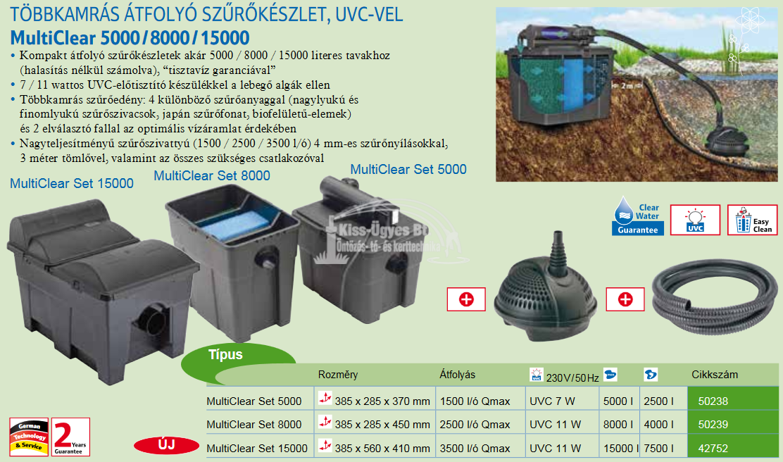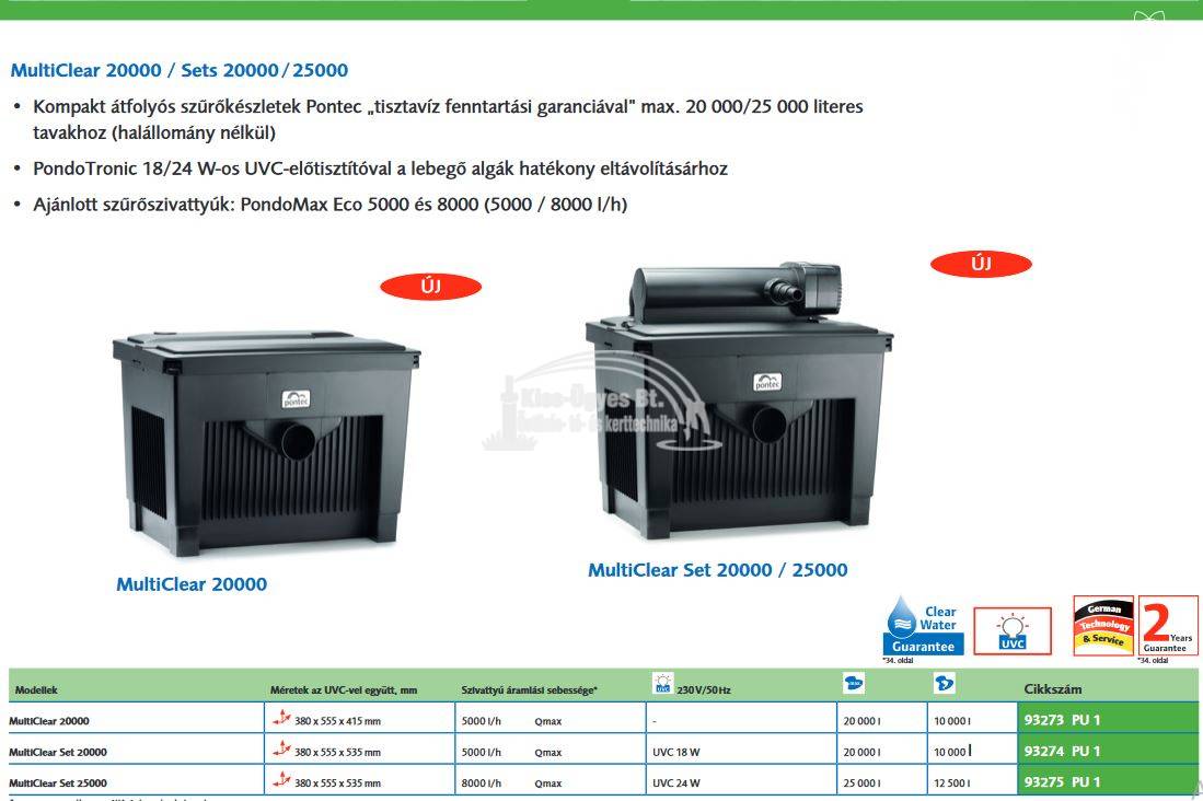 Pontec MultiClear Set 25000. Átfolyós szűrő szett, 24W UV-C szűrővel. Ajánlott PondoMax Eco 8000L/h szűrőtápláló szivattyú. Átfolyós vagy más néven gravitációs szűrő szett, 3 kamrás. 24W UV-C készülék a lebegő algák ellen, szűrő szivacsok a fizikai szennyeződések ellen, műanyag labdácskák a biológiai szűréshez, 3 fm tőmlő + csatlakozók. Halasítás nélkül 25.000L-ig, halasítás mellett 13.-16.000L-ig ajánlott a halasítás mértékétől függően.