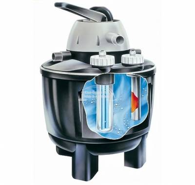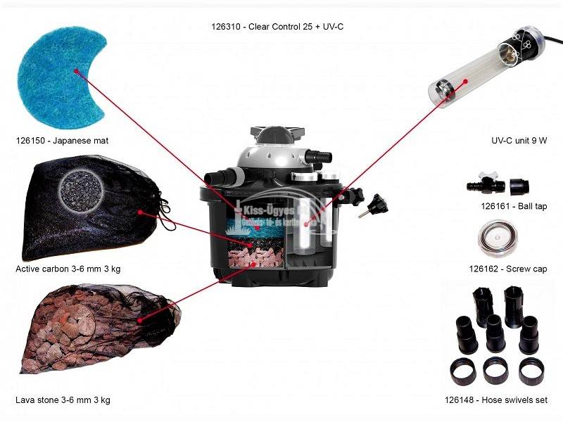 Velda Clear Control 25 Set, nyomásszűrő szett, 9W beépített UV-C készülék, Green Line 5000 -5.000L/h szivattyúval, ~ 5 fm tömlővel, csatlakozókkal. UV-C blokk lebegő algák ellen, szűrő filterek a fizikai szennyeződések ellen, aktív szén a kémiai anyagok ellen, lávakő a biológiai szűréshez. Üzemi nyomás 1.5 bar, a megtisztított vizet 1 m-es magasságig lehet felvezetni patak üzemeltetéséhez. Halasítás nélkül 10.000L-ig, halasítva 5-6.000L-ig a halmenyiség függvényében ajánlott. A szűrő tetején lévő, 7 fokozatba forgatható karral lehet beállítani a szűrő funkcióit, pl: 1. visszamosatás, 2. szűrés nélküli keringetés 3. kimosatás 4. szűrés 5. leállítás tisztításhoz (először a szivattyút kell leállítani) 6. gyógyszeres kezelés 7. téli leállás. 2 év garancia. Opcióként felszerelhető 300W-os fűtőkészülékkel.