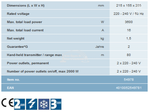 Oase InScenio FM-Master 1 elektromos kültéri aljzat távirányítóval, 3.600W maximális terhelhetőség, 16 A. 2db normál 230V-os kültéri aljzatot és 2db távirányítóval ki-be kapcsolható, együttesen max.2.000W-ig terhelhető kültéri aljzatot tartalmaz. A távirányító maximális hatótávolsága 80 m. A szett részét képezi még 1 db távirányító, 1 db leszúró tüske és 1 db műanyag ráhúzható műanyag fedél. Opcióként rendelhető hozzá mészkő hatású borító - takaró fedél. 2 év garancia.