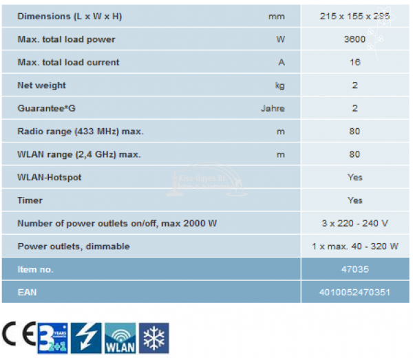 Oase InScenio FM-Master WLAN EGC elektromos kültéri aljzat, 3.600W maximális terhelhetőség, 16 A. Okostelefonról,  vagy tabletről (iOS vagy Android), WiFi-n keresztül vezérelhető. Egyszerűen töltse le az alkalmazást (az Apple Store vagy a Google Playen keresztül). Minden konnektorba 24 órás időzítő van beépítve. 3db távirányítóval ki-be kapcsolható, együttesen max.2.000W-ig terhelhető és 1 db távirányítóval ki-be kapcsolható, 40 - 320W-ig szabályozva terhelhető kültéri aljzatot tartalmaz. Akár 10 távirányítású OASE eszközt lehet integrálni és vezérelhető az alkalmazáson keresztül. A szivattyúk közül, melyek rendelkeznek teljesítményszabályozási lehetőséggel és-vagy WLAN-os csatlakozási lehetőséggel, a Jet jellegű szökőkutak, vízijátékok. A rádiófrekvencia és a WiFi maximális hatótávolsága 80 m. A szett részét képezi még 1 db távirányító, 1 db leszúró tüske és 1 db műanyag ráhúzható műanyag fedél. Opcióként rendelhető hozzá mészkő hatású borító - takaró fedél.
