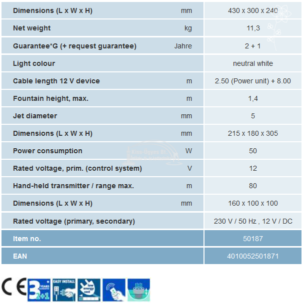 Oase Water Quintet szökőkút szett, színes led világítással. Csatlakoztatásra kész komplett szett. A szett tartalma: 5 db vízsugaras fúvóka világítással, 5 db szivattyú, külső vezérlőegység, távirányító, transzformátor és kábel. A programok, fehér fény és a vízkép látvány elemei is kényelmesen beállíthatók a távirányítóval. A távirányító hatástávolsága legfeljebb 80 m. A vízkép maximális magassága 0,3-1,4 m, képe tetszőlegesen beállítható. Robusztus padlólap véd a sérülésektől. Biztonságos, energiatakarékos 12 V technológia, úszótavakban is alkalmazható. Időzítőhöz is csatlakoztatható.