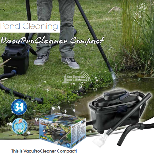 Ubbink Vacu ProCleaner Compact tóporszívó 3 az 1-ben, tóporszívó, vizes- és száraz porszívó. 10L kapacitású tároló, 1.000W teljesítmény. Autómatikus szennyezettvíz ürítés 12 másodpercenként. Kisebb tavakhoz, medencékhez ajánlott. Normál takarításhoz különböző fejekkel ellátva: szőnyeg, padló, bútor. Tartozékok: 4 görgős kerék, 4 m szívó gégecső, 1,5 m nyomó gégecső, 2 részes 1,5 m merev szívószár és a fentebb leírt tisztítófejek.