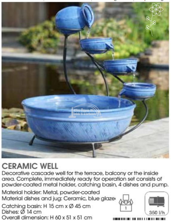 Ubbink Ceramic Well dekorációs szett, kék színű kerámia edények, a felső kancsó és a kis tálkák átmérője 14 cm, az alsó nagy tál átmérője 45 cm, magassága 15 cm, a szett méretei: magasság 60 cm, szélessége 51 x 51 cm. A hozzá tartozó vízpumpa 350 L/h. A tartószerkezet fém. Mutatós lehet kissebb kertrészben, teraszon, medence mellett, vagy beltérben.
