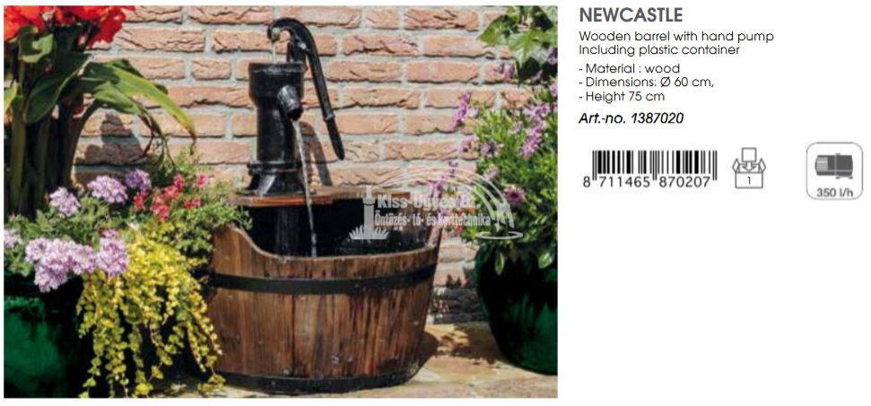 Ubbink Newcastle dekorációs szett, norton kút fa dézsával, melyben van egy műanyag vízgyűjtő tartály, 350L/h szivattyú. Méretek: dézsa átmérője 60 cm, teljes magasság 75 cm.