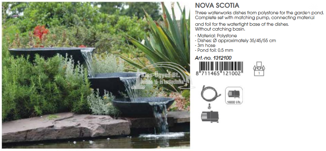 Ubbink Nova Scotia dekorációs szett, áll 3 db műgyantás kőporból készült kőhatású tálból, méreteik: D 35/45/55, egy 1.600L/h teljesítményű szivattyúból, 3 fm vízbekötő csőből, alátét tófóliából a tálak alá, hogy az esetlegesen mellé fröccsenő vizet vissza vezesse a tóba, vagy a vízgyűjtő edénybe, mérete: 0,5 mm vastag, 1,5 x 2 m. A szett ebben a formában csak tóból, medencéből, meglévő vízgyűjtő tartályból üzemeltethető, mivel a szett vízgyűjtő tartályt nem tartalmaz. A tartály és a rávaló rács külön megvásárolható.
