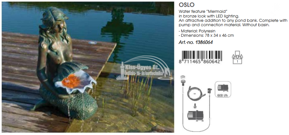 Ubbink Oslo LED vízköpő szett, LED világítással. Bronz hatású sellő szobor, vizes elemmel, led világítással, 600 L/H szivattyúval, vízbekötő csővel 78 x 34 x 46 cm.